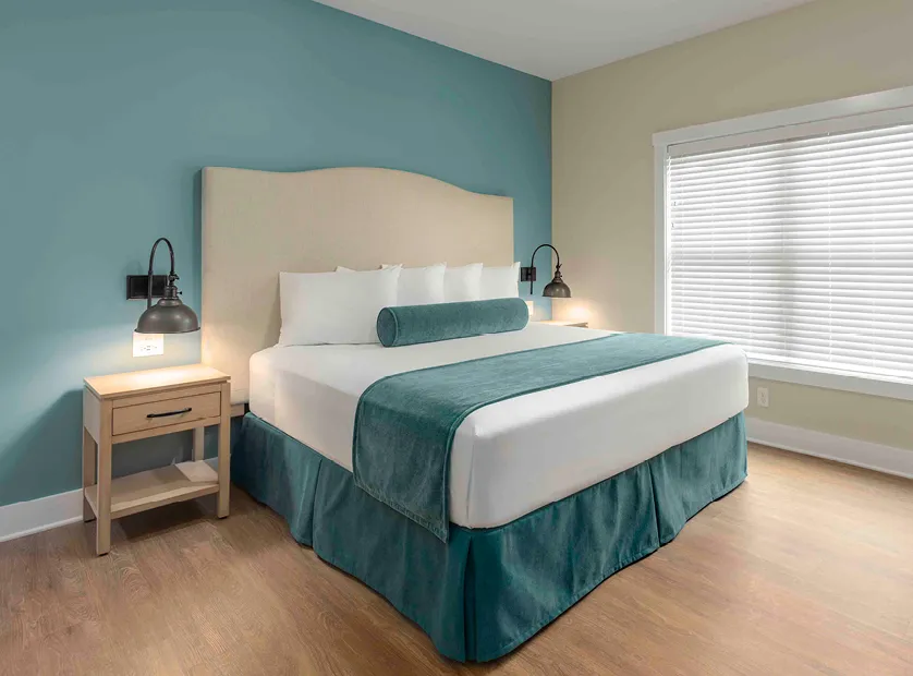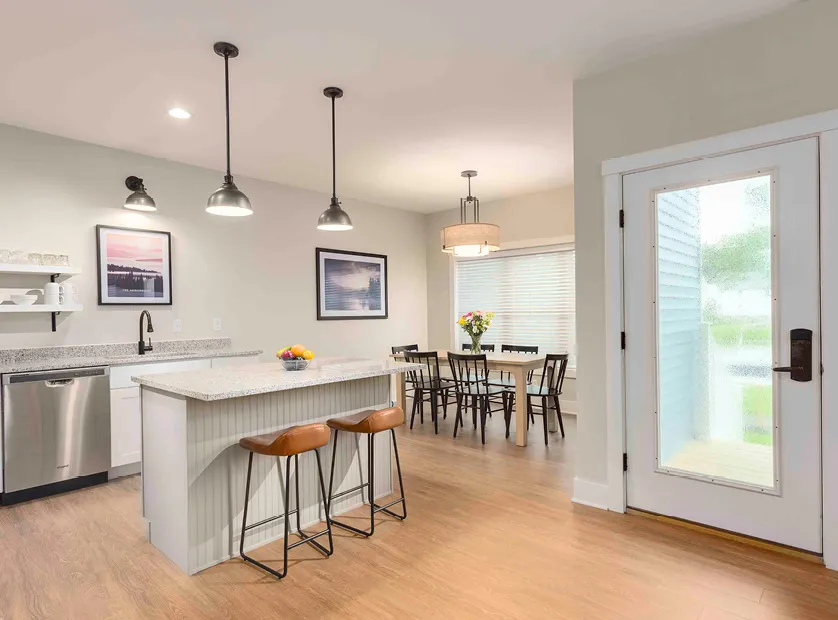 These cottages feature full kitchens and your own washer and dryer. They’re dog friendly and include firepits and grills. There’s an onsite playground and a heated community pool.