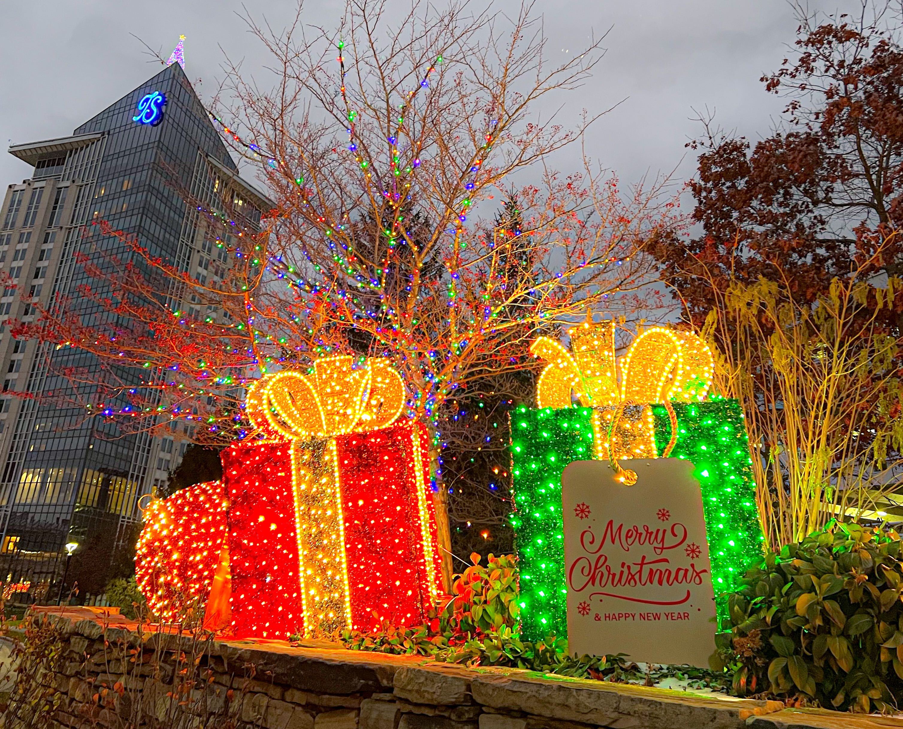 - Six oversized illuminated ornaments and ten large illuminated gift boxes