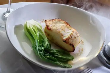 Steaming grilled black cod plated with leafy greens