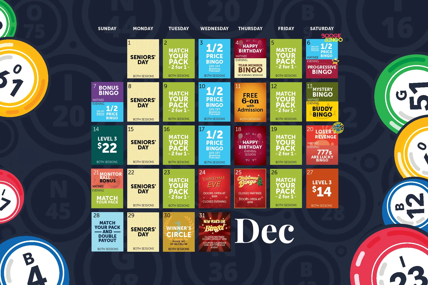 Bingo main sessions begin at 12:45pm and 7:00pm at the Turning Stone Bingo Hall. However, smaller games can also be played throughout the day with Early Bird Bingo Sessions starting at 10:15am/4:30pm, Supermini Bingo Games starting at 11:15am/5:30pm, and Warm Up Sessions starting at 12:30pm/6:45pm.