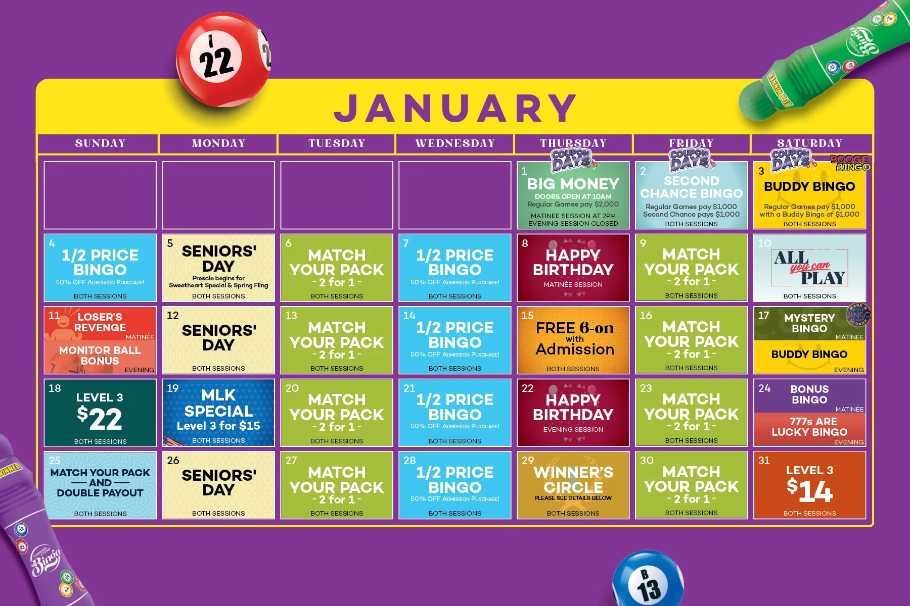 The Magic numbers are progressive bonuses played with each regular games. The magic number bonus is available for $5 and can be added to any admission purchase. The Magic number for each regular game is drawn prior to the start of the regular session. If the player calls bingo and stops the game, and the last ball called in the verified bingo pattern is the Magic number associated with the game, the player will win the coordinating progressive posted.