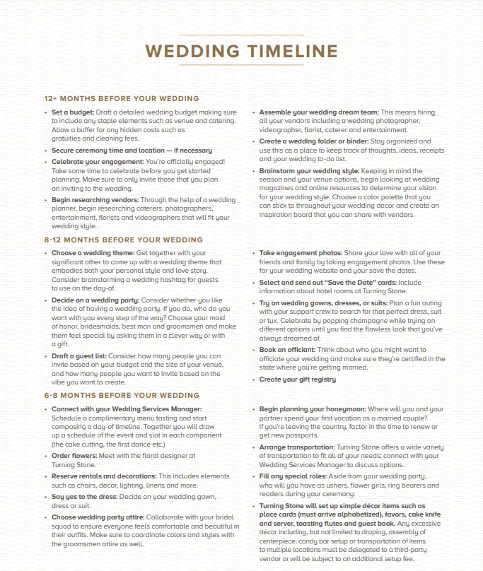 A solid budget is the key to a stress-free planning experience. Include all the big-ticket items like your venue, catering, and any other must-haves. Remember, unexpected costs can pop up, so add a buffer to your budget for things like gratuities or cleaning fees. For luxurious touches that fit within your budget, consider the expert planners and beautiful settings Turning Stone offers.
