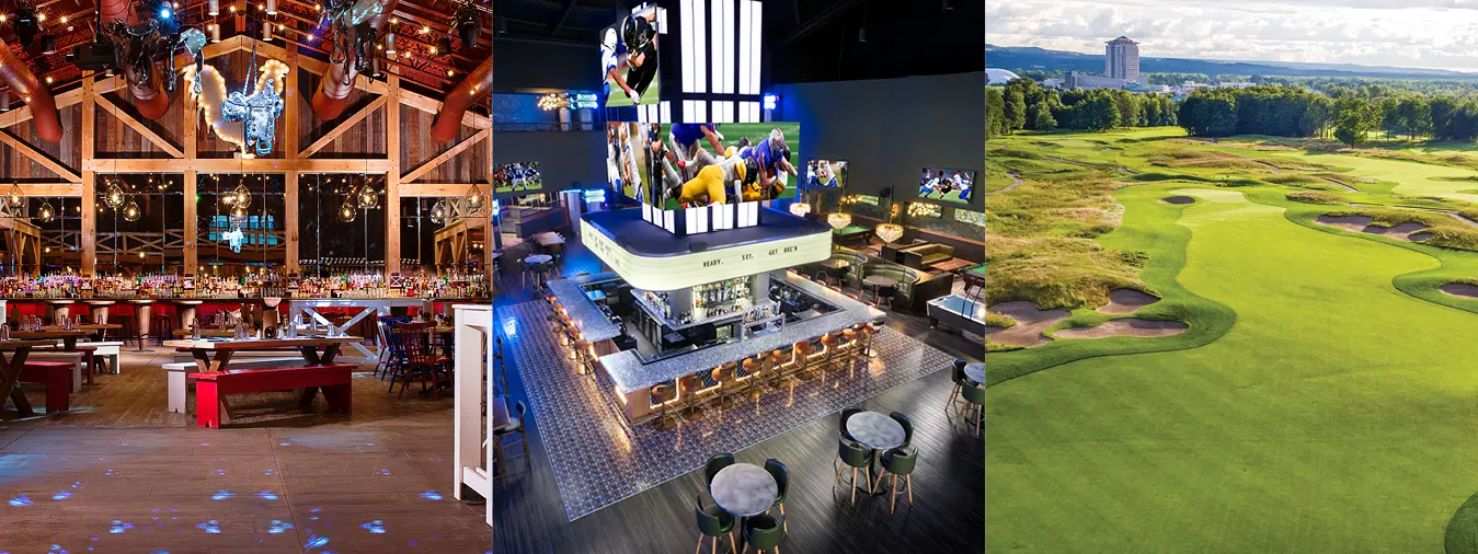 While nightlife at Exit 33 at Turning Stone —and the new NY Rec & Social Club – has always been a draw for post-wedding celebrations, having a wedding at a destination resort this size means couples never have to worry about entertaining their guests. According to one of our wedding experts, as much as 85% of wedding weekends include requests for golf: buddies golfing, an afternoon on the greens with the girls before the big day or golf for the parents the following morning. With three championship courses and two 9-hole courses plus an indoor year-round golf complex, golf is a fun way to bring people together to extend the celebration.