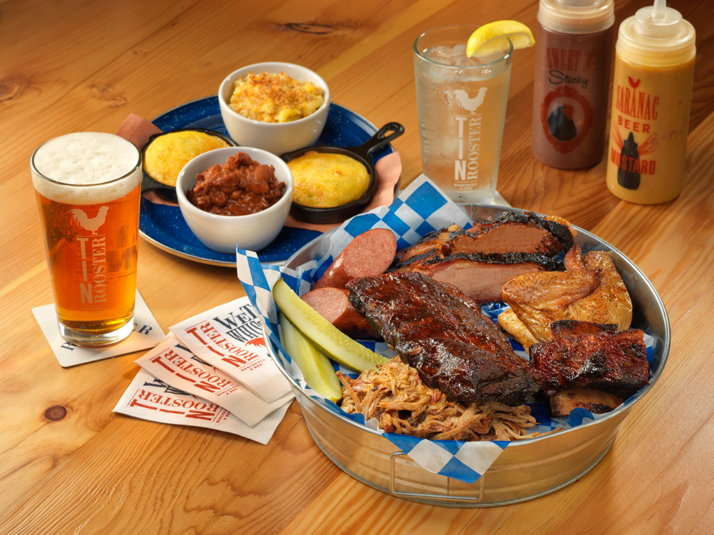 Responding directly to guest feedback, Tin Rooster sought to give guests more flexibility and options when ordering. Additionally, the restaurant’s signature platters – stockpiled with smoked meats and sides – are now customizable, allowing guests to combine any two meats with their choice of two sides or any three meats with any three sides. Meats include smoked ribs, pulled pork, kielbasa, brisket and turkey breast, and come with a choice of seven flavorful house-made sauces, including White BBQ, Whiskey Black Pepper, Bacon BBQ and the fresh-and-tangy House Ketchup. Tin Rooster’s list of sandwich and burger options have expanded as well, which now include pulled pork grilled cheese, honey wood-grilled chicken, the Rooster Burger and The 33 Burger – all burgers are handmade and hand-pressed. Sides include comfort-food favorites, such as mac n’ cheese, hush puppies, salt potatoes – a Central New York favorite – whipped bacon potato salad, cheesy corn, and more.