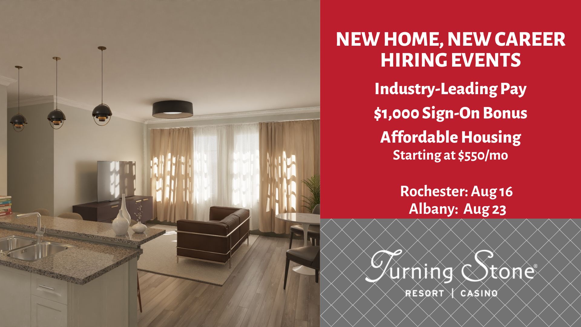 As New Yorkers in Rochester, Albany and across the state struggle to find affordable housing, Turning Stone Resort Casino is launching the “New Home, New Career” campaign to recruit new employees to relocate to Central New York. Hiring managers from Turning Stone will be in Rochester on Tuesday, August 16th and Albany on Tuesday, August 23rd to find cooks, line cooks, chefs, table games dealers and a range of other hospitality positions to join the team. The hiring event represents the first time Turning Stone Resort Casino has recruited on-site in the Rochester and Albany areas. Qualified candidates will be given job offers on the spot.